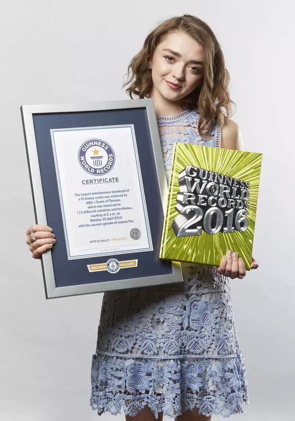 the Guinness Book of Records for being the largest television drama simulcast. The drama broke the record after episode two of season five (The House of Black and White) was shown earlier this year in 173 countries simultaneously. The award was received by Maisie Williams who acts Arya Stark in the drama on behalf of the show.